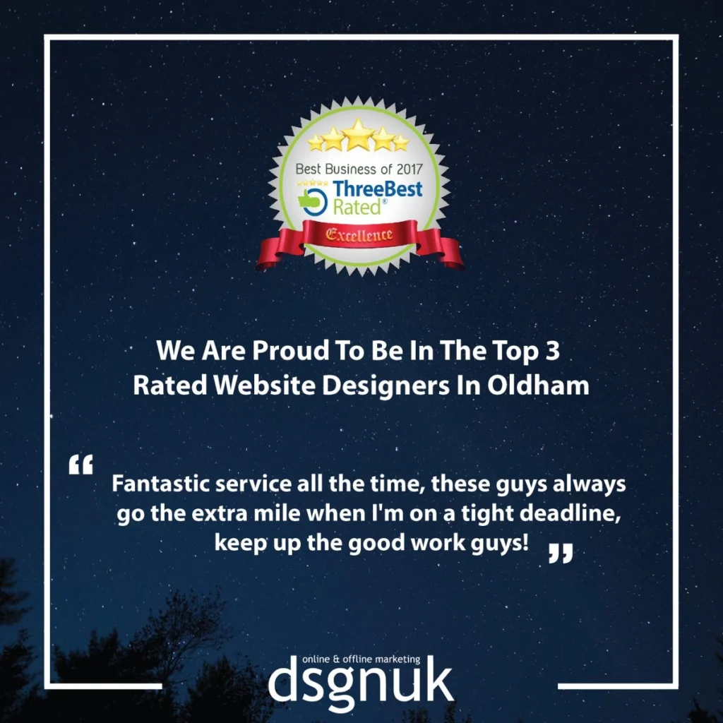 We are proud to announce and share that we have been awarded as one of the Top 3 website designers in Oldham. We have been awarded this fantastic achievement thanks to our excellent reputation, proud history, local reviews, customer satisfaction, trust and cost. All these values mean so much to us as a company and to be rewarded for this was a very proud moment. This achievement signals our continuous improvement and expansion as we strive to become the leading web developers and web designers in Oldham and beyond. Our team has worked incredibly hard to achieve this and we now boast some very large sites & clients thanks to this. Despite this expansion and growth it has been important for us to stick to our core business values and continue with our motto, designing tomorrow today. For a look at some of our recent work go to www.dsgnuk.com/portfolio-landing-page.
